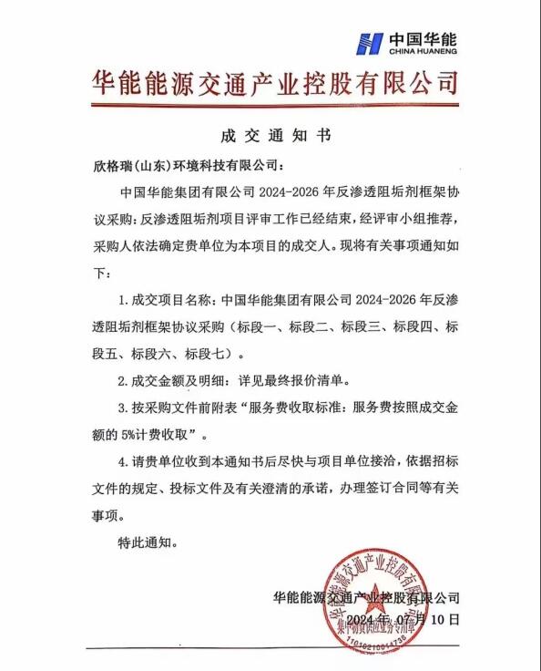 近日,欣格瑞公司憑借在水處理藥劑集采項目再傳捷報,繼在中國大唐集團有限公司2023-2025年度水處理大宗藥品反滲透藥劑長協(xié)采購成功中標后,公司再度發(fā)力,高效率、高質量地完成了中國華能集團有限公司2024-2026年度反滲透阻垢劑框架協(xié)議的公開招標工作,成功中標該框架協(xié)議下七大標段的所有反滲透阻垢劑項目。這一系列中標成果,不僅是大型發(fā)電集團對欣格瑞公司技術實力、產品質量、運營管理經驗及市場信譽的全方位肯定,更是公司在中國乃至全球水處理市場中有強勁競爭力的證明。